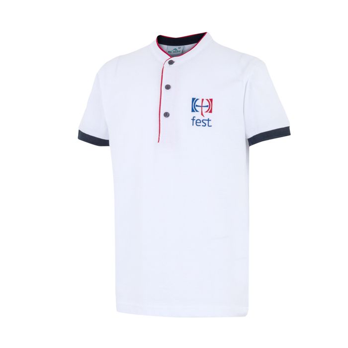 • Polo colegial de manga corta, realizado en pique con cuello mao y parte final de las mangas en canalé.